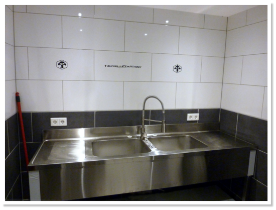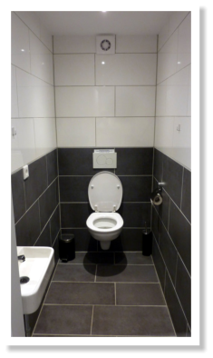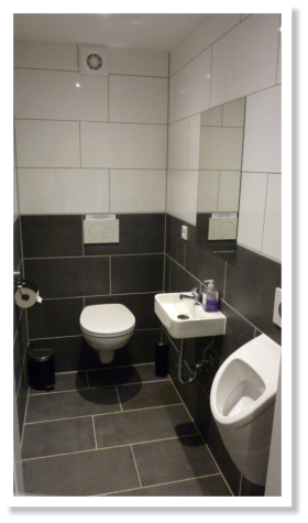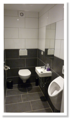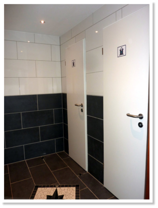 Damentoilette, Herrentoilette und Wasch/Spülraum mit warmen Wasser.