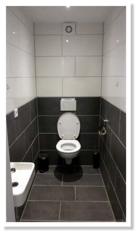 Damentoilette, Herrentoilette und Wasch/Spülraum mit warmen Wasser.